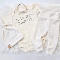 Perfect gender neutral baby gift. Trendy onesie for your new little babe! Oatmeal onesie features black screen print. Onesie only. Add the coordinating pants, hat and headband for the complete look!Â