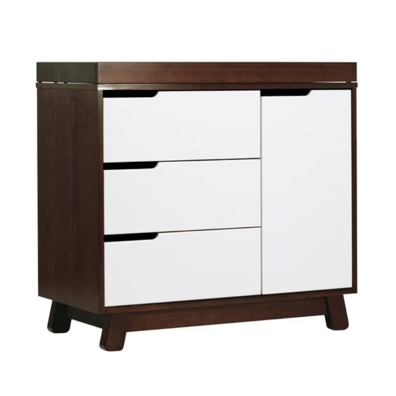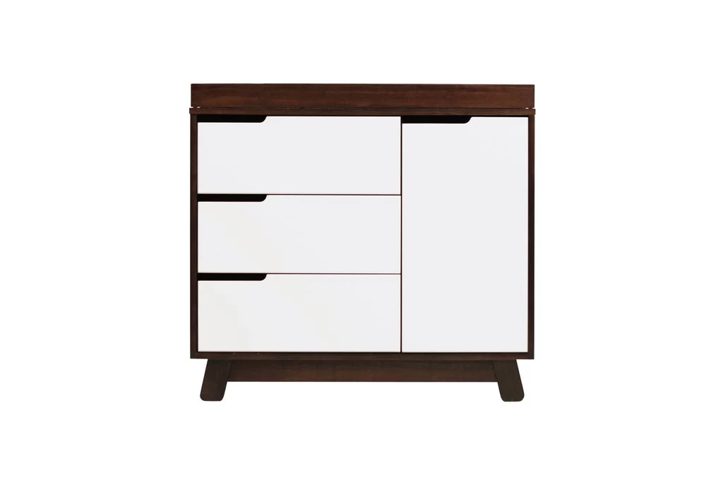 Get more from your nursery furniture with the versatile Hudson Changer Dresser. Combining a changing table, three drawer dresser, and storage cabinet all in one solid and practical package, the Hudson Changer Dresser is a modern space-saving convenience. Complementing the mid-century modern-inspired Hudson 3-in-1 Convertible Crib, the dresser comes in three chic finishes including two new takes on two-tone for the nursery. Truly built for baby, the removable changer tray’s raised sides help keep your little one safe, and an anti-tip kit is included for further security. Keep baby’s clothes and necessities organized in the smooth-opening drawers, while stop mechanisms prevent them from being pulled all of the way out. The storage cabinet closes gently and includes an adjustable shelf, perfect for keeping diapers and wipes handy.