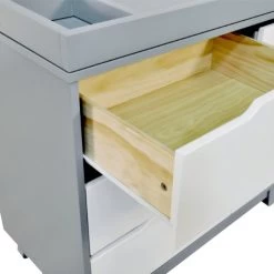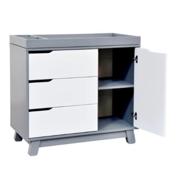 Get more from your nursery furniture with the versatile Hudson Changer Dresser. Combining a changing table, three drawer dresser, and storage cabinet all in one solid and practical package, the Hudson Changer Dresser is a modern space-saving convenience. Complementing the mid-century modern-inspired Hudson 3-in-1 Convertible Crib, the dresser comes in three chic finishes including two new takes on two-tone for the nursery. Truly built for baby, the removable changer tray’s raised sides help keep your little one safe, and an anti-tip kit is included for further security. Keep baby’s clothes and necessities organized in the smooth-opening drawers, while stop mechanisms prevent them from being pulled all of the way out. The storage cabinet closes gently and includes an adjustable shelf, perfect for keeping diapers and wipes handy.