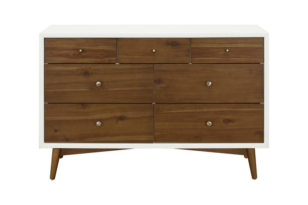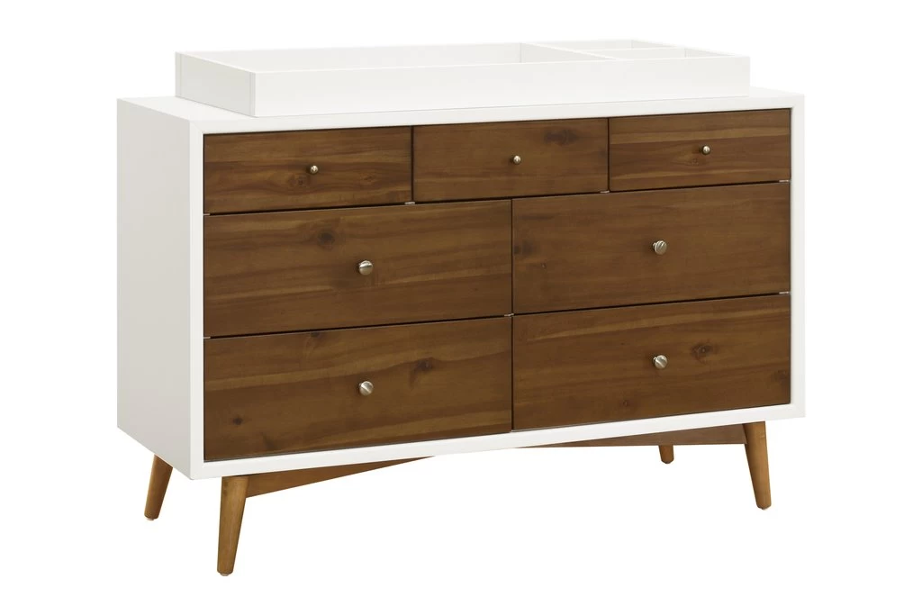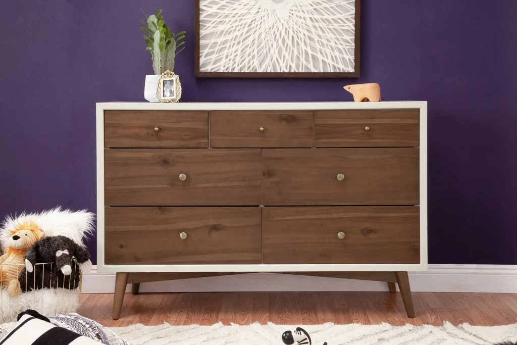 The Palma 7-Drawer Double Dresser is a stylish and sophisticated mid-century design, featuring a classic X-frame, flared tapered legs and charming brushed metal hardware. Three smaller top drawers and four larger drawers on the bottom provide plenty of storage options for both large and smaller items and make it a versatile modern piece that can transition from nursery or bedroom to living room or study. Made with eco-friendly, non-toxic materials, the dresser arrives fully assembled, ready out of the box to upgrade any modern home. Pairs with Babyletto Palma 4-in-1 Convertible Crib and Peggy 3-in-1 Convertible Crib.