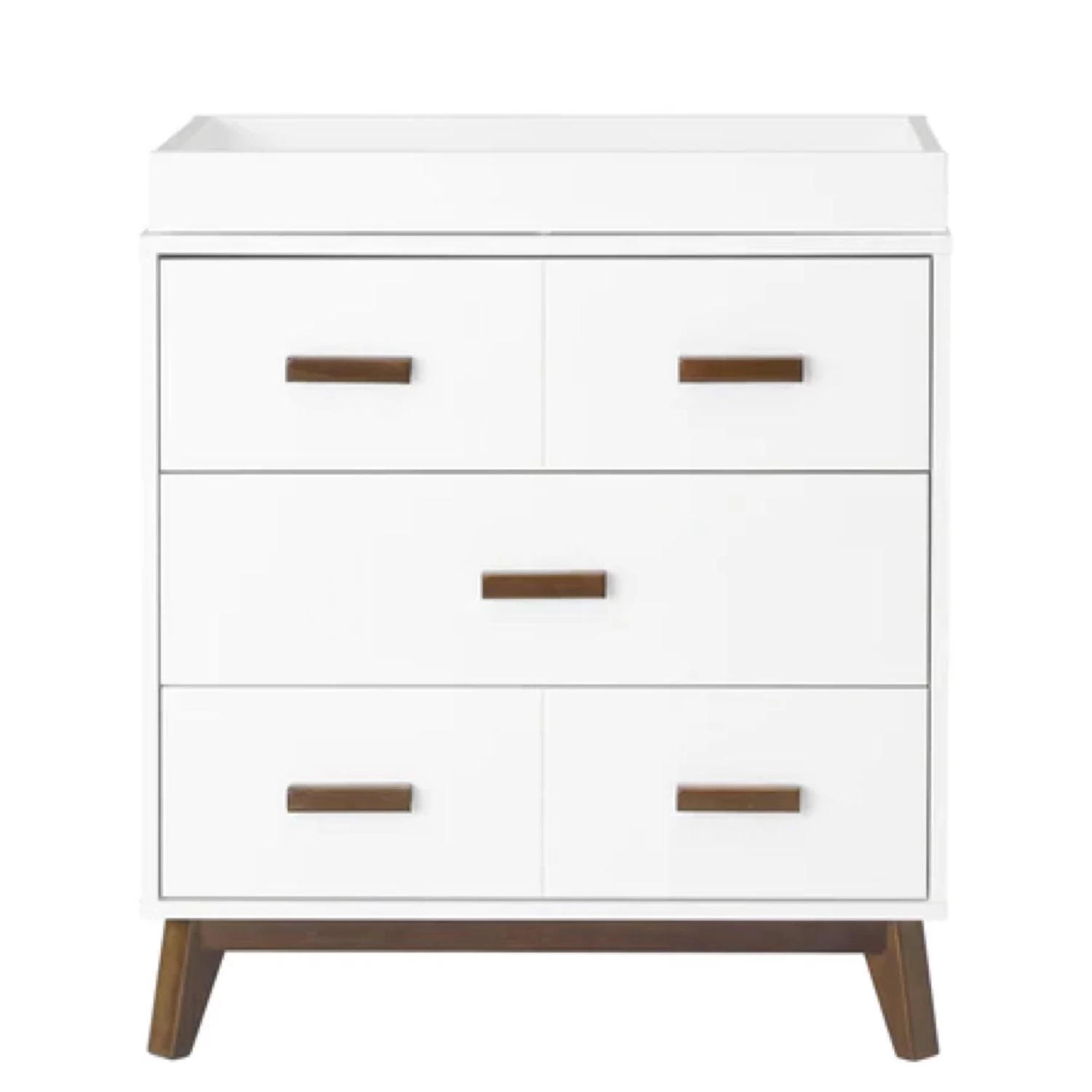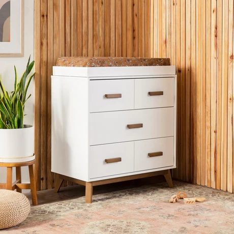 The Scoot 3-drawer Changer Dresser is the definition of mid-century modern style. The perfect accompaniment to your Scoot 3-in-1 Crib with matching tapered feet and two-toned or solid color detailing. With three smooth-glide drawers and an included removable changing tray, this compact unit provides a range of practical storage possibilities to suit all of your nursery needs.