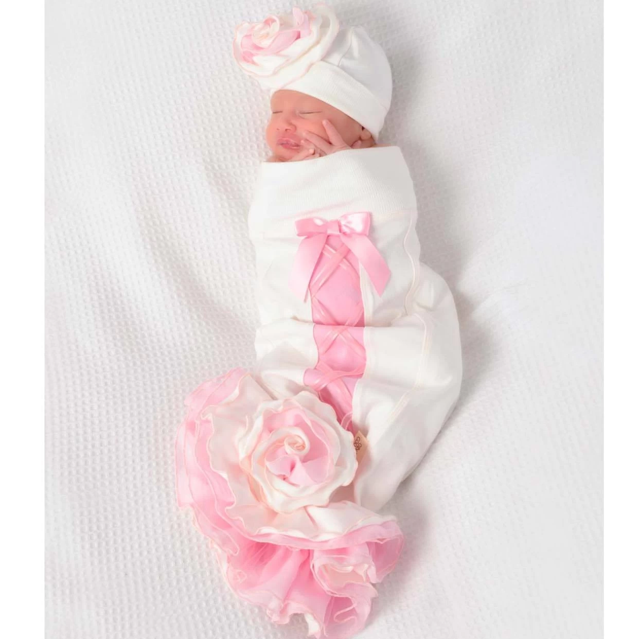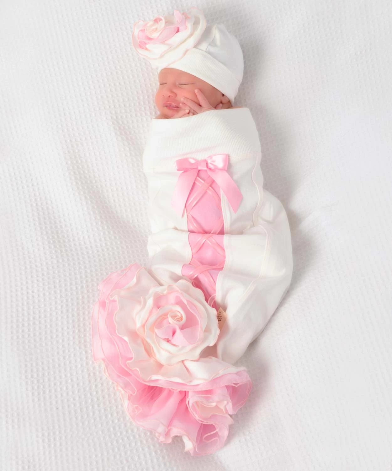 - Set includes hat, cocoon & hand-made cotton & tulle flowers.