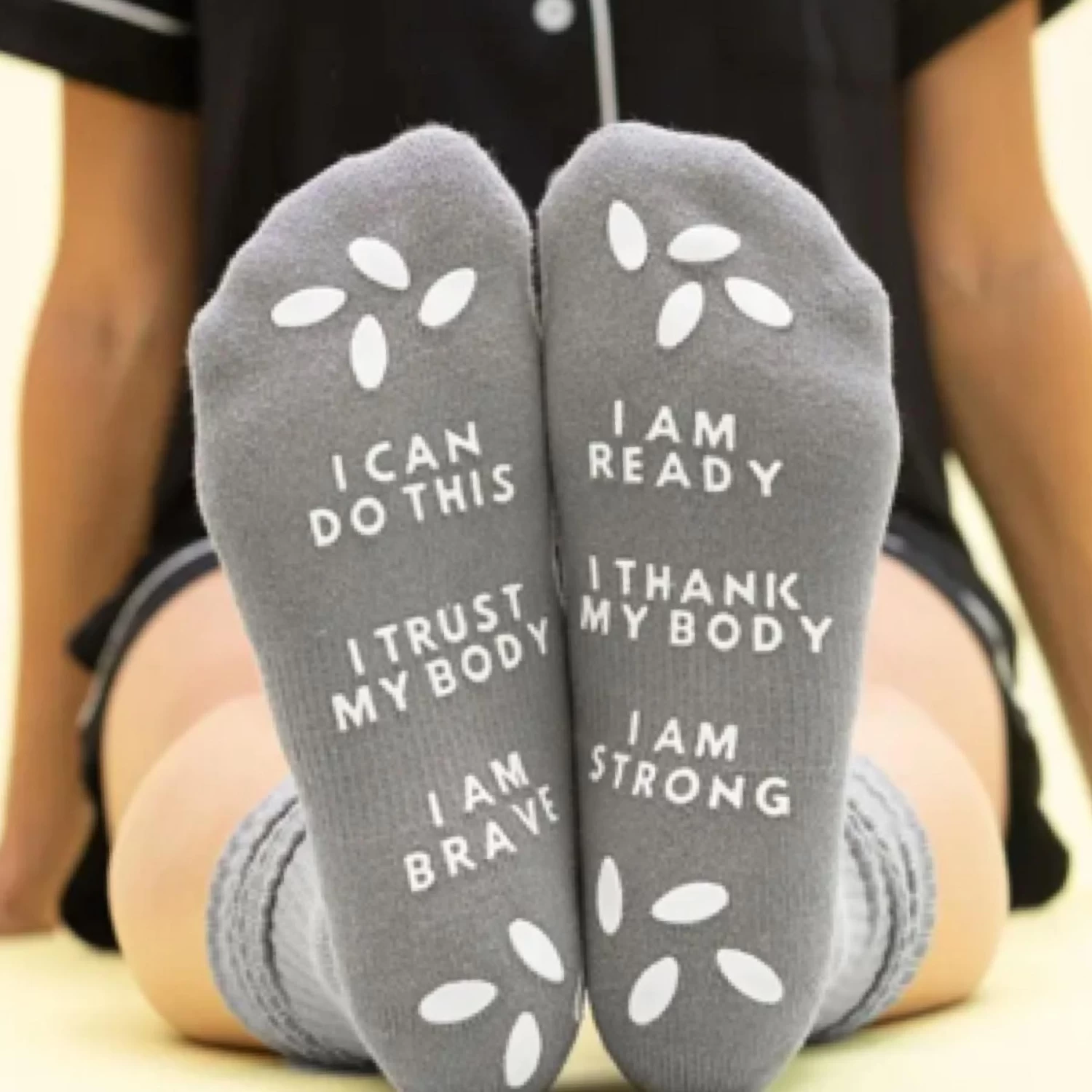Go through labor and delivery with birthing affirmations on your side! Or, on your feet! These non-slip socks are meant to encourage and support Mama in her childbirth journey. With six affirming statements on the soles, these socks will cheer her on while keeping her cozy and safe. The nonskid grips add plenty of traction, so she won’t slip when walking the halls or pacing the hospital room. Also, helpful to wear at home on wood or tile flooring. These socks are a wonderful and thoughtful gift for baby showers, push gifts, or hospital bags.