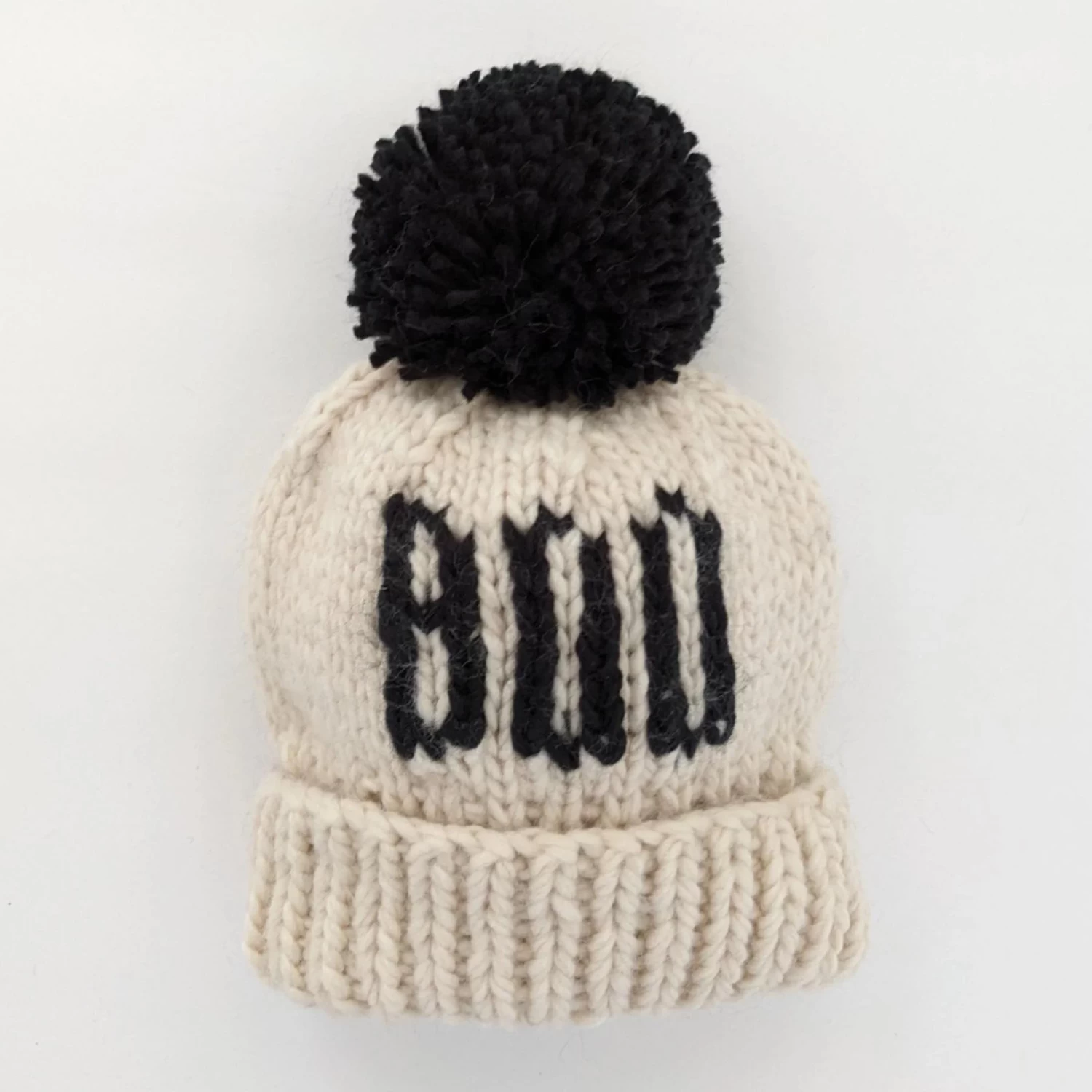 Get ready for Halloween in this fun hat with the word BOO on the front. Knit in natural colored yarn, the word BOO is knit in black. It’s trimmed with a matching natural cuff and black yarn pom pom. Hand knit in cozy, thick acrylic yarn, this hat perfect for fall and makes a great gift! It comes in Black too, so mix and match the entire family in these cute hats!