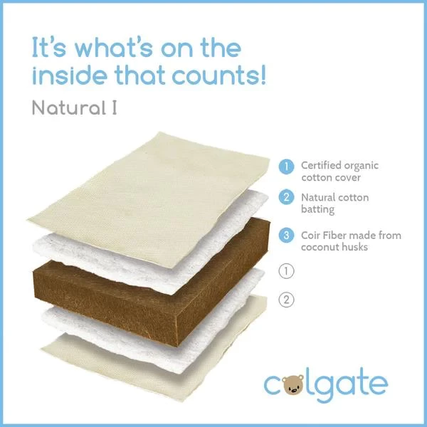 Nominated as a finalist for the “Healthiest Crib Mattress” in the Cribsie Awards, the Natural I uses absolutely no metals and plastics in its innovative design. Instead, this 5” thick crib mattress features natural and renewable component materials, coir fiber made from coconut shell husks, bonding from an all-natural latex, and natural cotton cushioning layers. These unique components are wrapped inside a ultra-soft, certified organic cotton cover. Along with being ecologically-friendlier, the cover is tear-resistant and hypoallergenic. Like all Colgate mattresses, the Natural I is GREENGUARD ® Gold certified, CertiPUR-US ® certified, CPSIA compliant, and compliant with all federal and state flammability requirements – without the use of fire retardant chemicals. Your Natural I is proudly made by Colgate Mattress, The Crib Mattress Specialist®, a family-owned and operated business dedicated to baby’s safety since 1955.