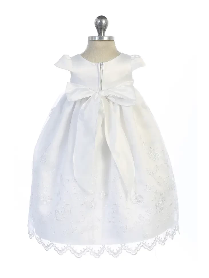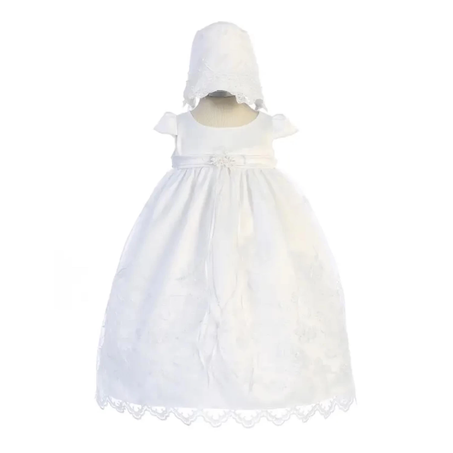 Cross embroidered organza christening gown with satin sleeve top. Comes with matching bonnet.