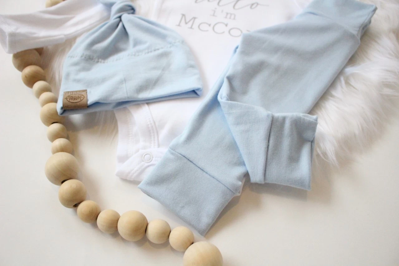 Trendy onesie for your new little man! White onesie features grey screen print in Hello I’m New Here or Personalize with the Name.Â