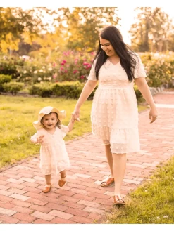 Elegant takes on a whole new meaning with the Eden Mommy & Me dress! With an adorable cut and short sleeves, this dress will bring you from Spring to Summer to Fall seamlessly. Wear with little sandals and a bow for a classic look, and mama can pair wedges and a cute bag for an equally stunning style! Whether you’re going to brunch, a picnic, church, or anywhere in between!