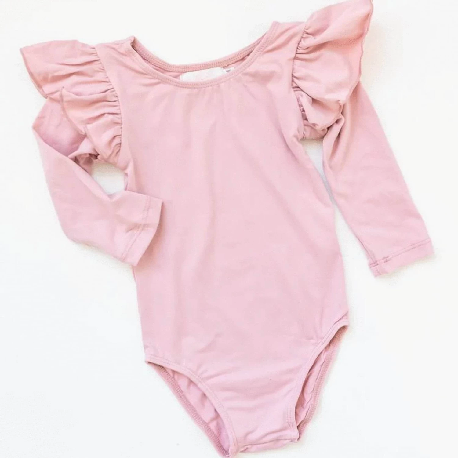 A little frill for your little free spirit! Perfect for layering. This leotard features flutter sleeves!