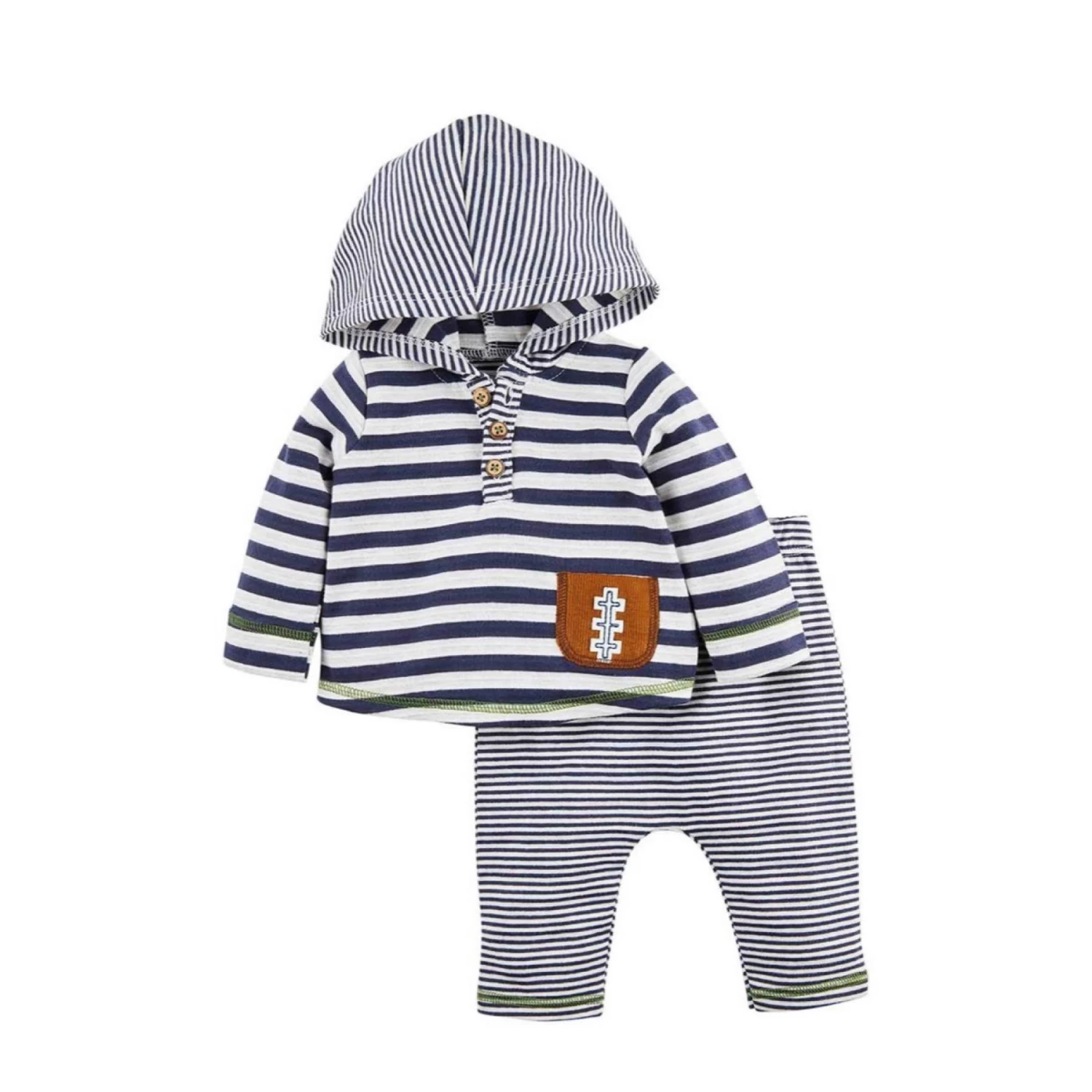 2-piece set. Double jersey hoodie with coconut wood button chest placket and football pocket. Comes with coordinating pull-on pants.