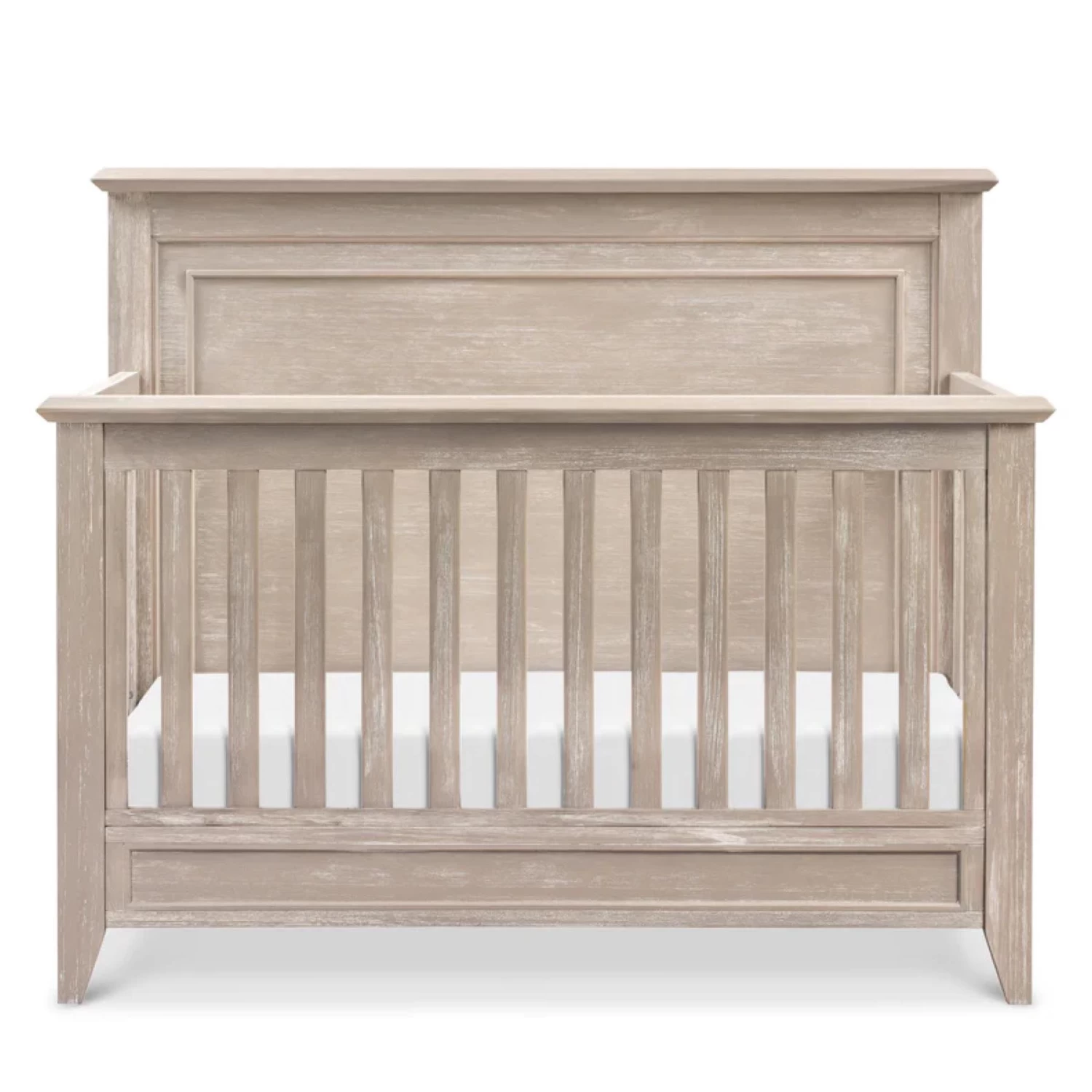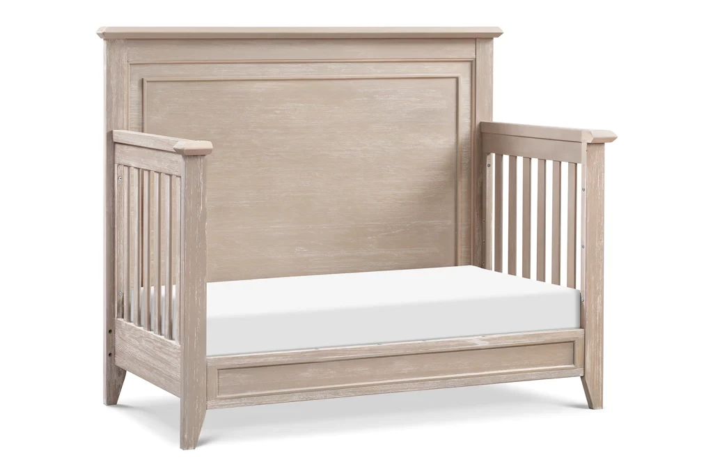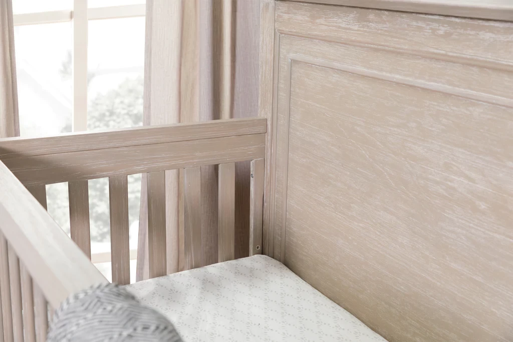 The Beckett Rustic 4-in-1 Convertible Flat Top Crib bridges the gap between traditional and modern design with its texturized wood finish, clean silhouette and thoughtful detailing. Featuring a raised back panel, elegant slats, simple tapered feet, and mitered cuts with contemporary 45 degree trimming, the Beckett Crib is a transitional piece that will grow with your family.
