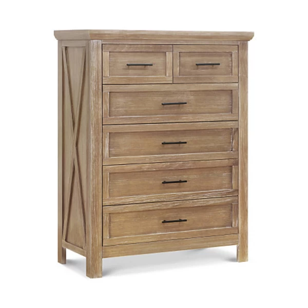 The Emory Farmhouse 6-Drawer Chest combines rustic and modern designs to provide a beautiful and functional storage space for your nursery. A perfect addition to the Emory Farmhouse 4-in-1 Convertible Crib & Emory Farmhouse 6-Drawer Dresser, the Emory Farmhouse Chest features 6 deep drawers with self-closing, ball-bearing glides for ease of use.