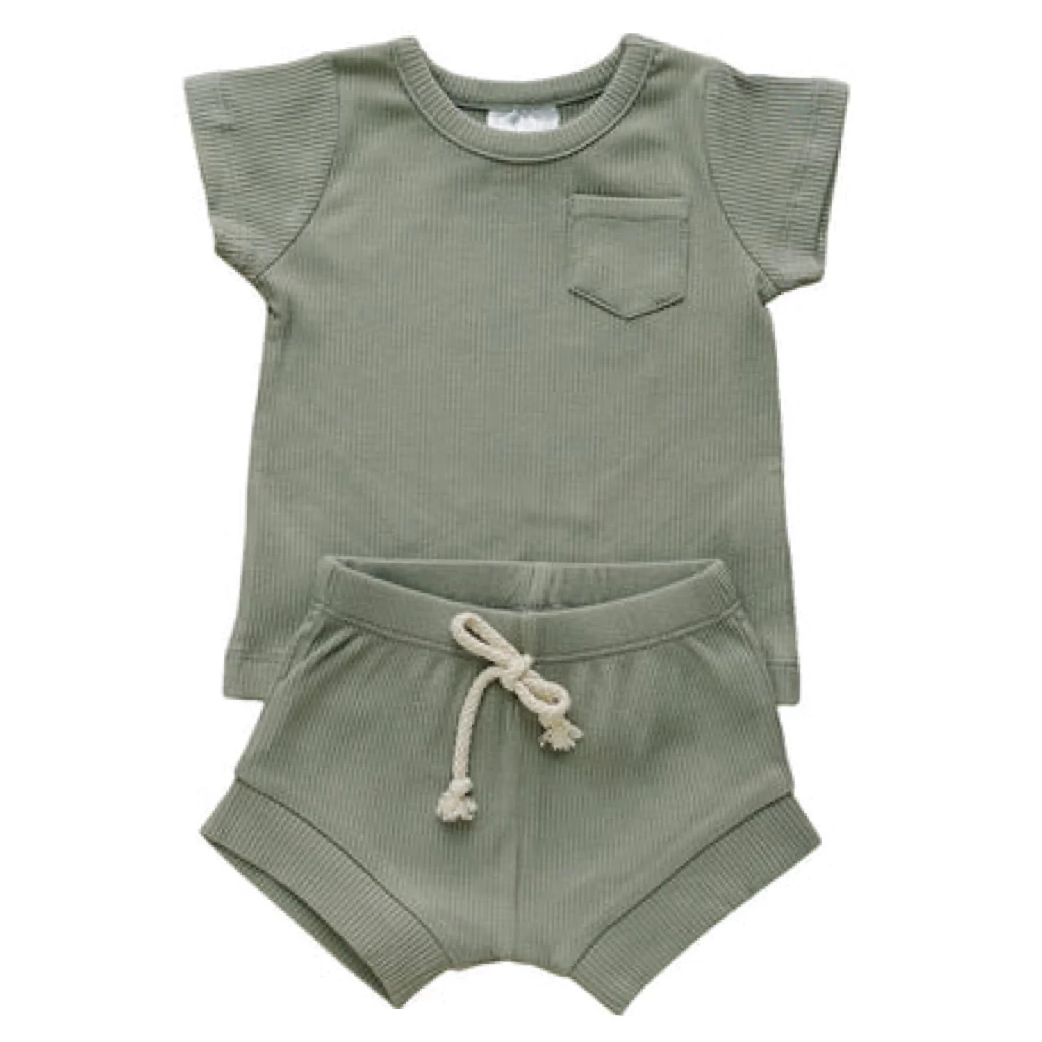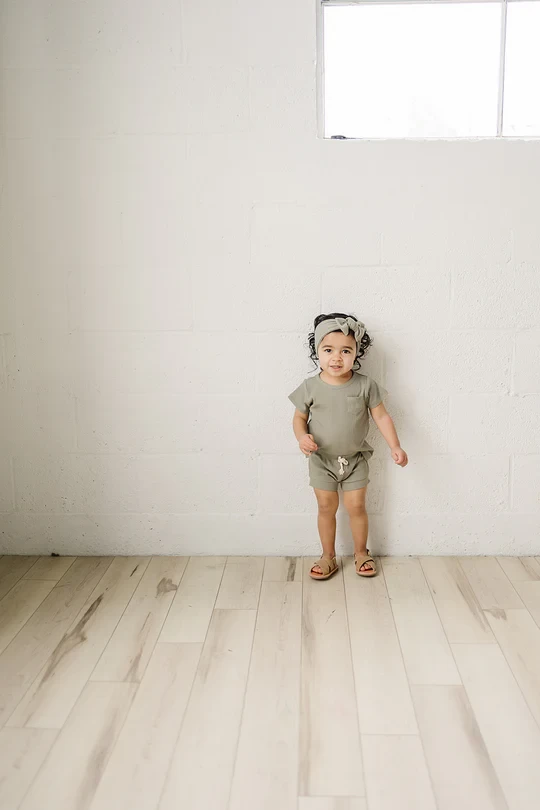 This two-piece set is for babies and toddlers. These come with a short sleeve top + elastic shorts with a faux tie. They are so soft and functional!Â