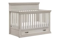 Embrace transitional English country style with the Langford 4-in-1 Crib. Blending rustic farmhouse charm with contemporary detailing, the Langford features a timeless straight edge silhouette with clean molding and an under drawer with satin finished metal drawer accents.Â
