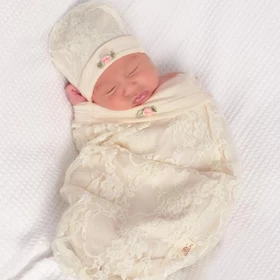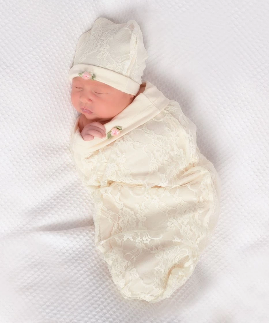 Brilliant swaddling concept in gorgeous lace lined in soft stretchy cotton knit. Simply roll up over baby stretchy cotton that hugs. Your little darling remains totally cozy while looking totally fabulous.