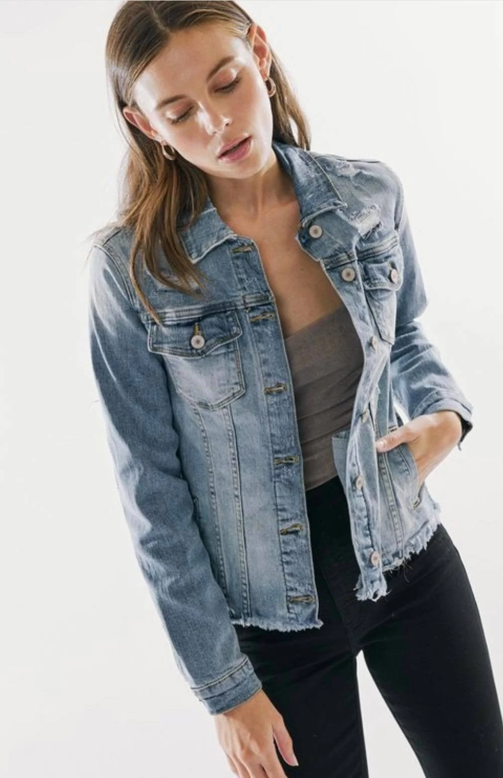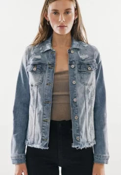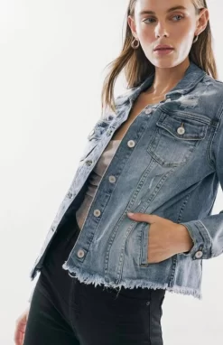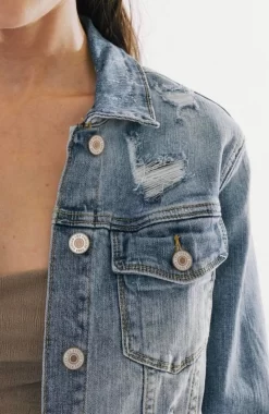 - A slight, boxy fit denim jacket featuring seam-highlight fading,