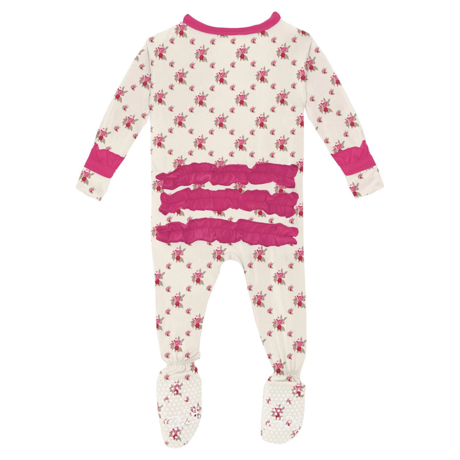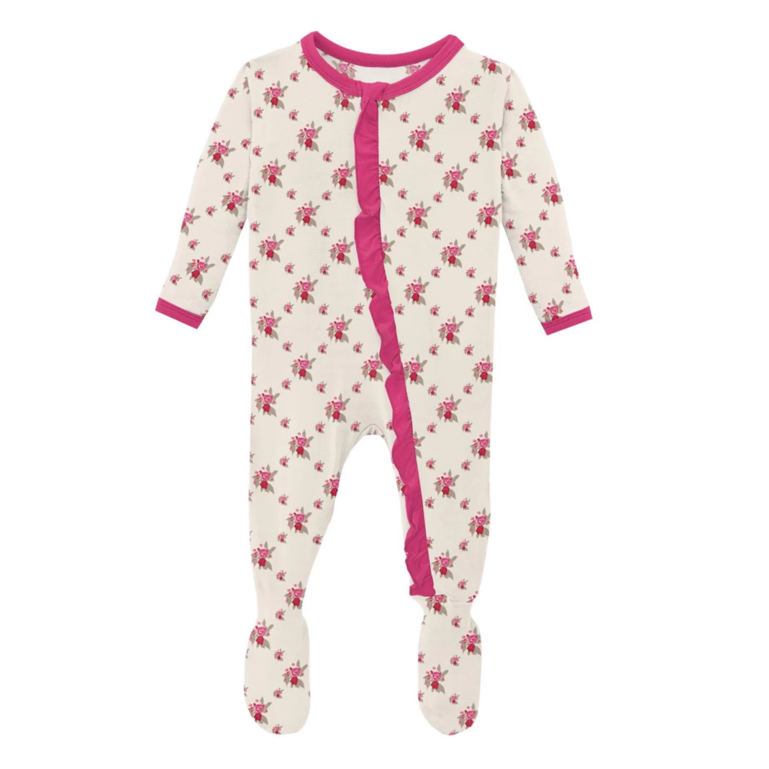 KicKee Pants Classic Ruffle Footie With Zipper – Natural Rose Trellis