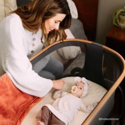 Versatility’s important, too. That’s all thanks to the Iora’s five different height positions that to give you a customized fit. Not only does the Iora adjust up and down, but side to side as well. For those moments in the middle of the night when your baby wakes up crying, you can easily glide the bassinet closer to the bed to give comfort and care.