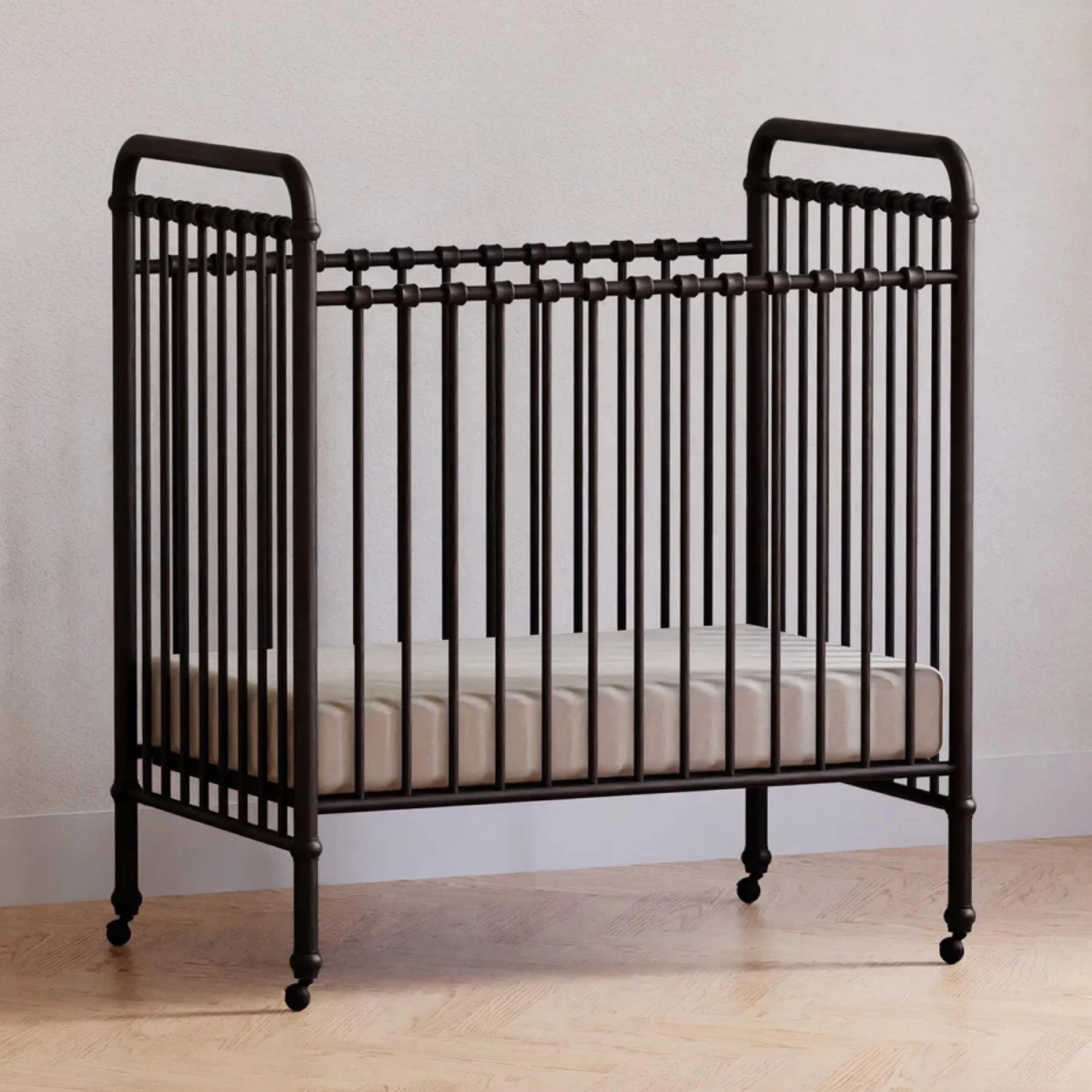 The best-selling Abigail Crib has been reimagined for small spaces – perfect for nursery nooks, shared bedrooms, and grandma’s guest room. It’s a smart alternative to a bassinet that will last longer and convert to a toddler bed and daybed as your little one grows. The Abigail 3-in-1 Convertible Mini Crib features a portable design with removeable casters, premium steel and traditional metal casting at the joints to emulate vintage American style.