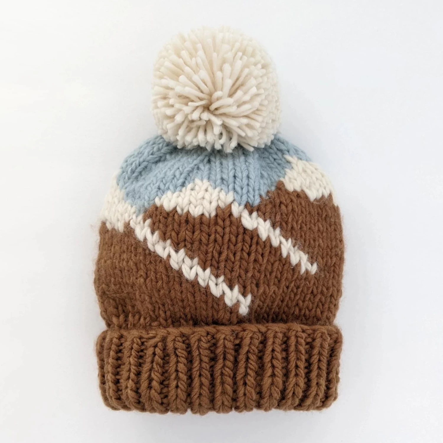 This snow capped mountain range is hand knit in Natural, Cocoa and Soft Blue colored yarn and topped with a matching natural yarn pom pom. Hand knit in cozy, thick acrylic yarn, this hat perfect for cooler weather. This is perfect for any outdoor lover and makes such a wonderful gift.