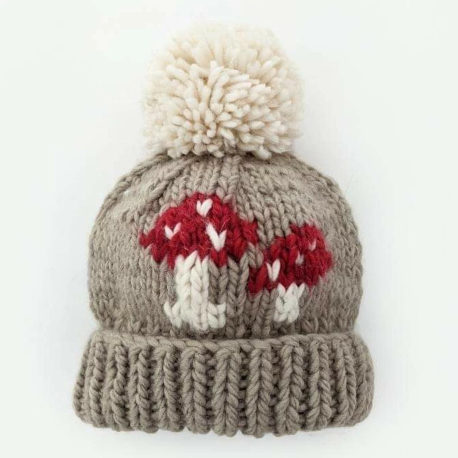 this fun Oatmeal colored hat has a red mushroom design with a fold-up cuff. Topped with a pom pom, this looks great with everything and is a fun gender neutral baby gift.Â