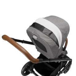 Rugged rubber tires with enhanced all-wheel suspension make for smooth strolling over any type of terrain, while premium fabrics with leatherette details create a stroller that’s as stylish as it is practical.