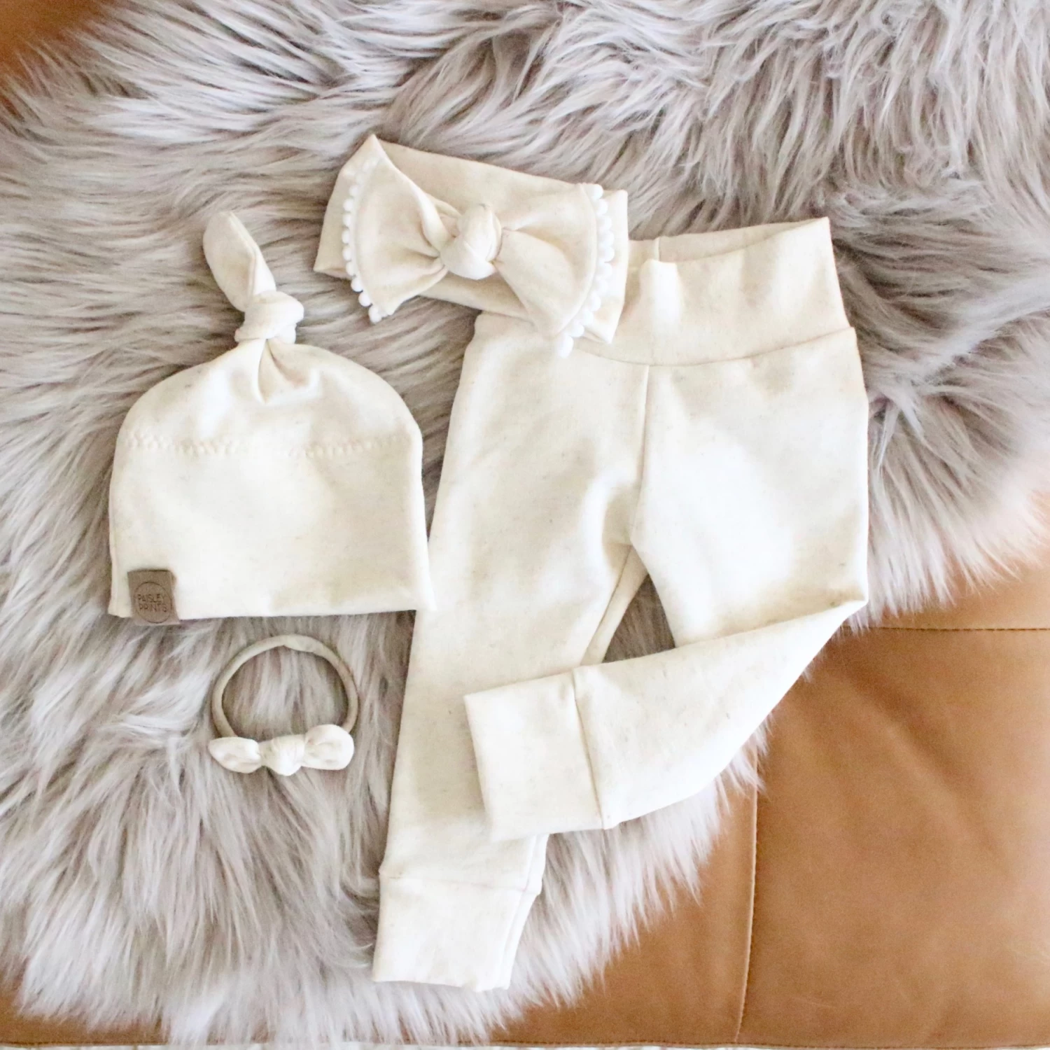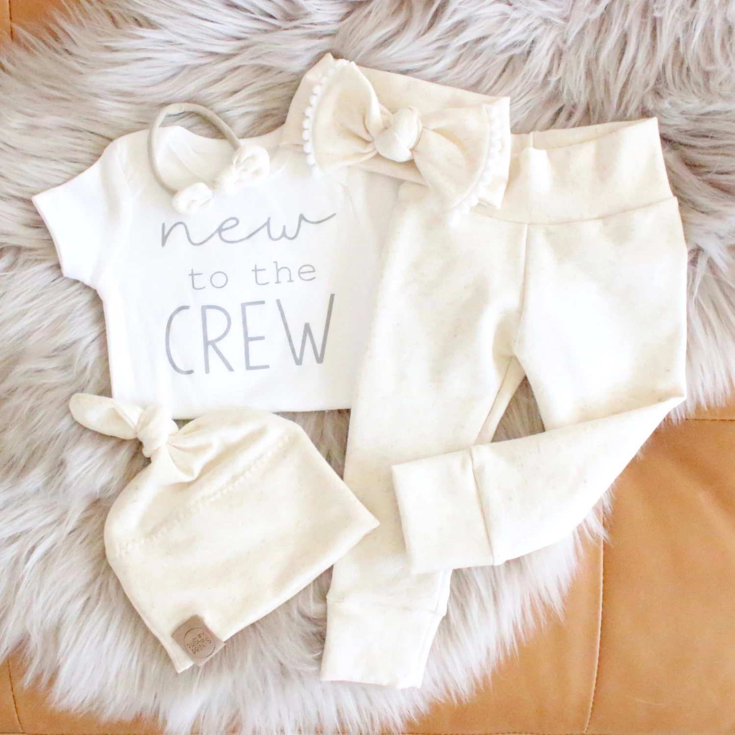 Perfect gender neutral baby gift. Trendy onesie for your new little babe! Oatmeal onesie features black screen print. Onesie only. Add the coordinating pants, hat and headband for the complete look!Â