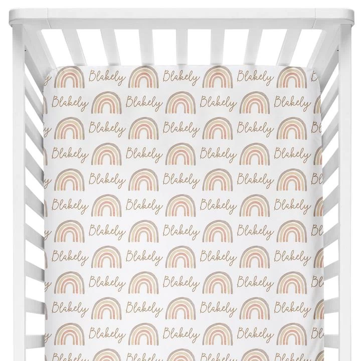 This personalized crib sheet features a modern neutral rainbows! It either comes in plush fleece or stretch jersey.