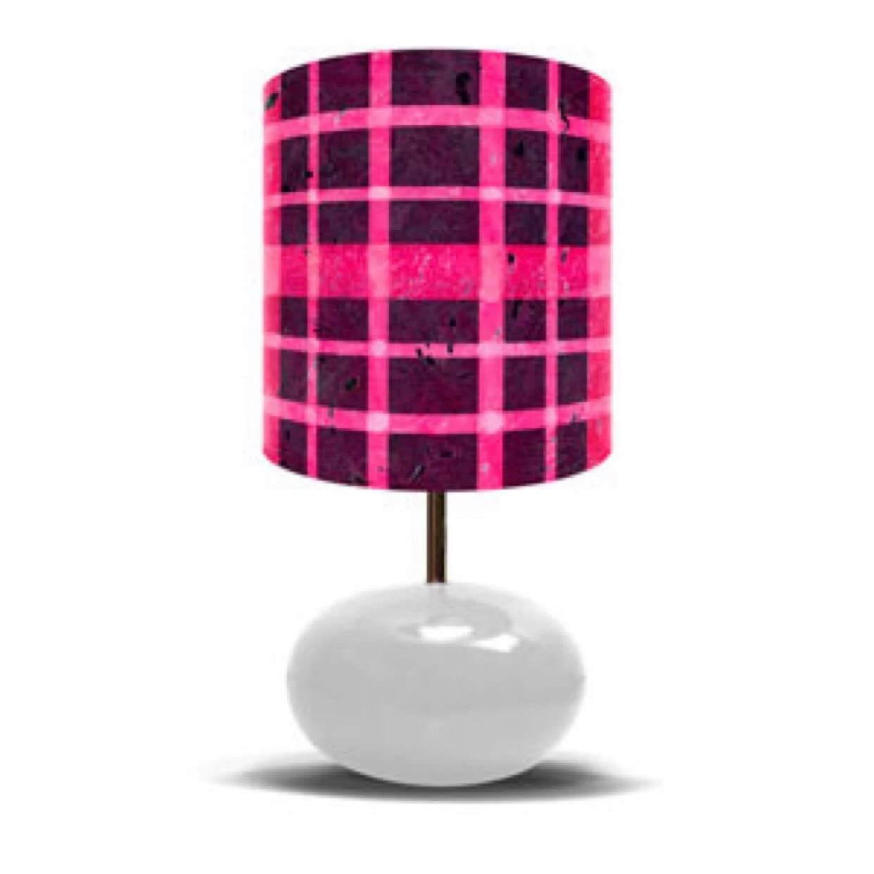 Add light to any room with this Pink Plaid on White Base Lamp. These lamps are approximately 21 tall x 11 wide and include a canvas art shade atop a gumball-shaped ceramic base.Â