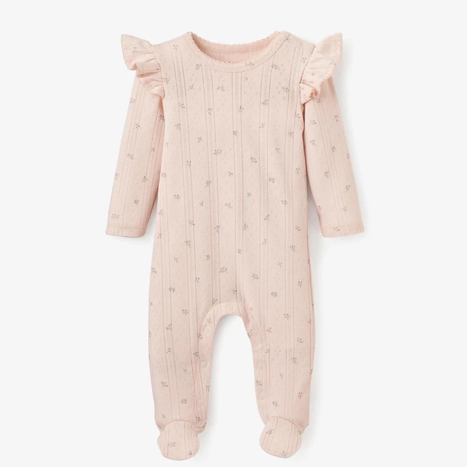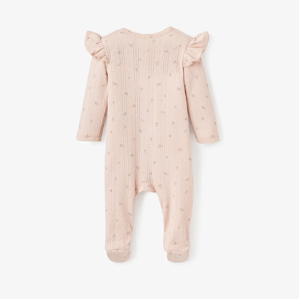 From newborn naps to crawling and toddler exploration, this ultra soft organic cotton pointelle baby jumpsuit is delicate yet durable. Featuring a dainty floral print with ruffle detail, this piece encompasses both function and style.