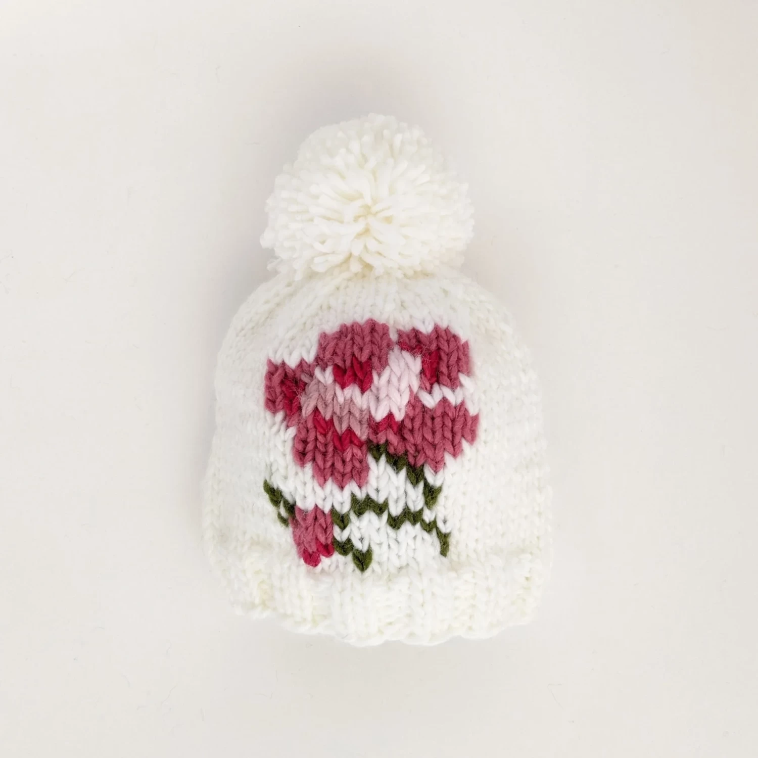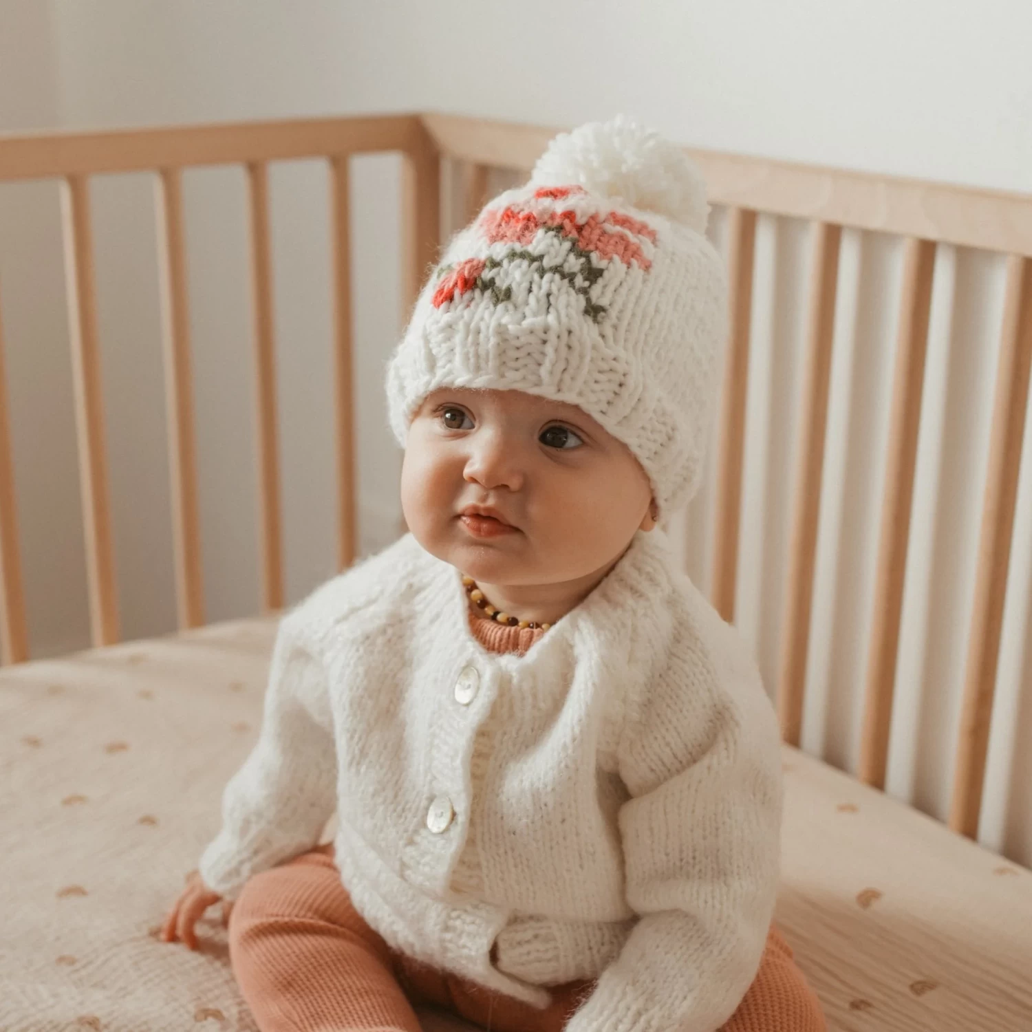 A lovely Rose bloom is knit in shades of pink and green on a white ground. It’s so soft and cozy and perfect for cooler weather.