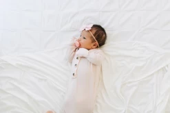 The easiest tie-bottom outfit for day or night. Made for hassle free diaper changes and gentle dressing, I designed this with a button-down front and tie bottom for simple closure (no more snaps at 2am!). Fold over wrist cuffs are the most thoughtful finishing touch.