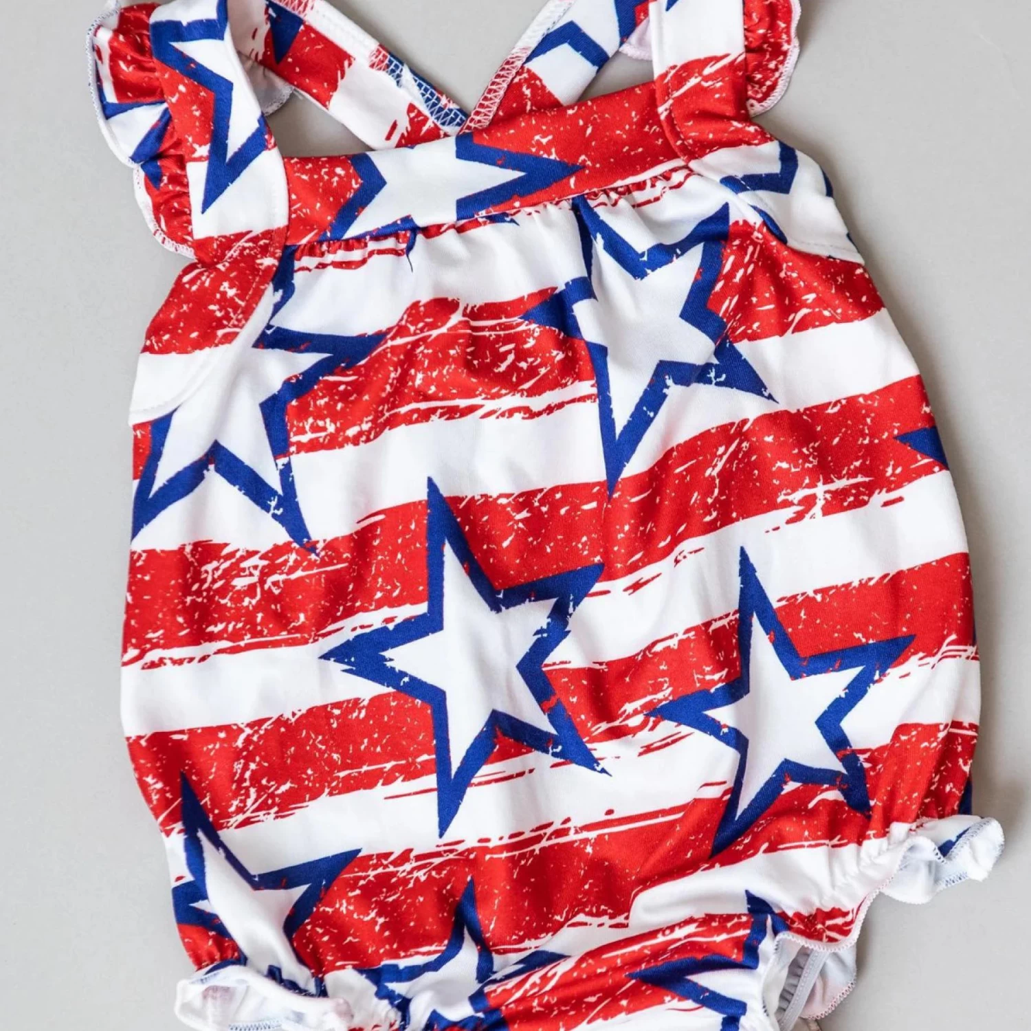 This Strappy Romper is perfect for summer! Straps criss cross in the back and are finished off with a sweet ruffle on the shoulder. Snaps for easy diaper changes.Â