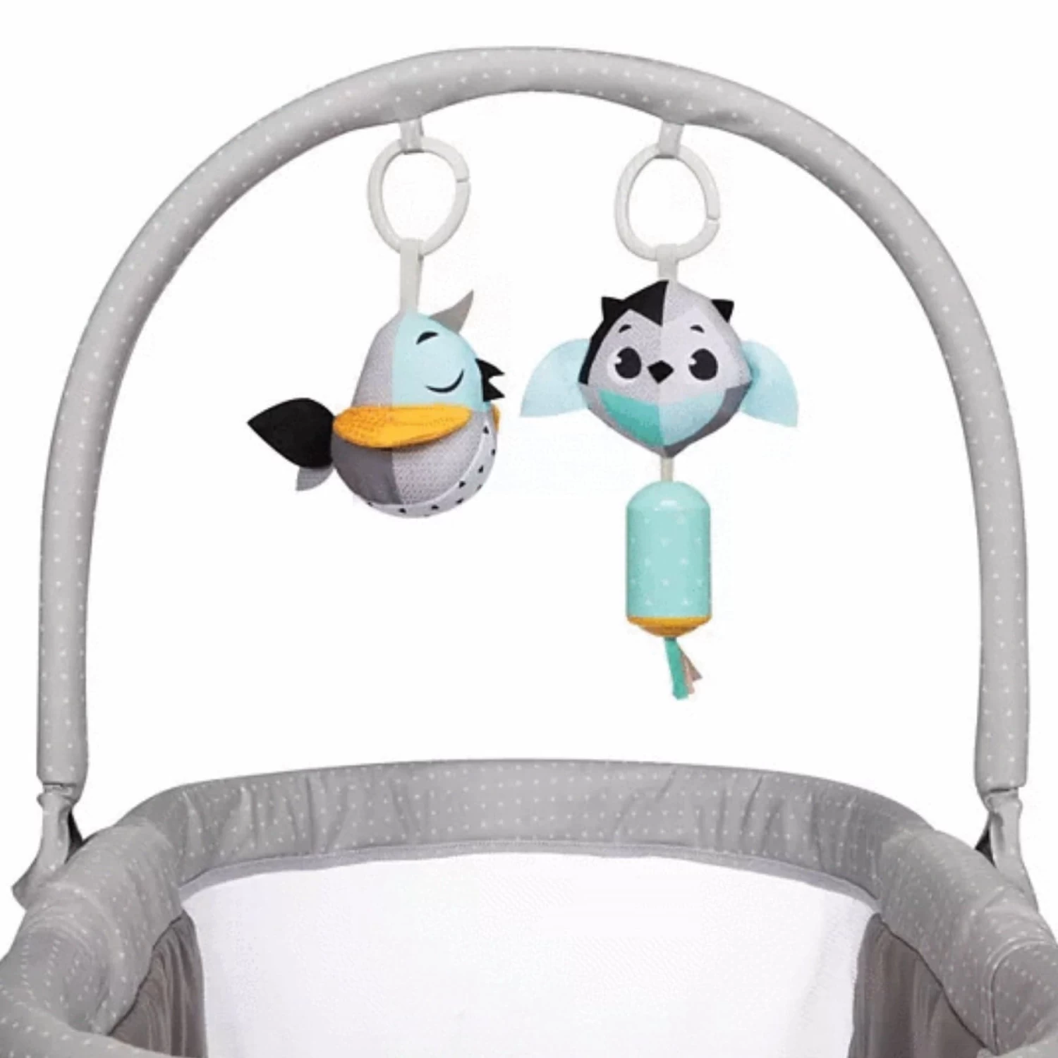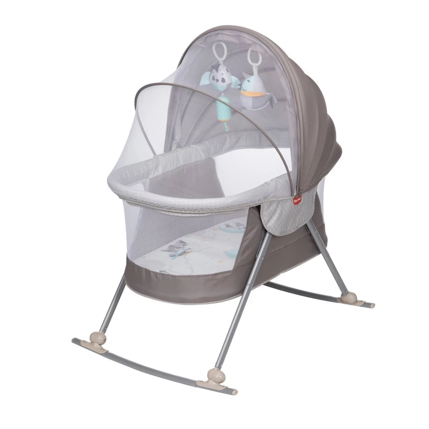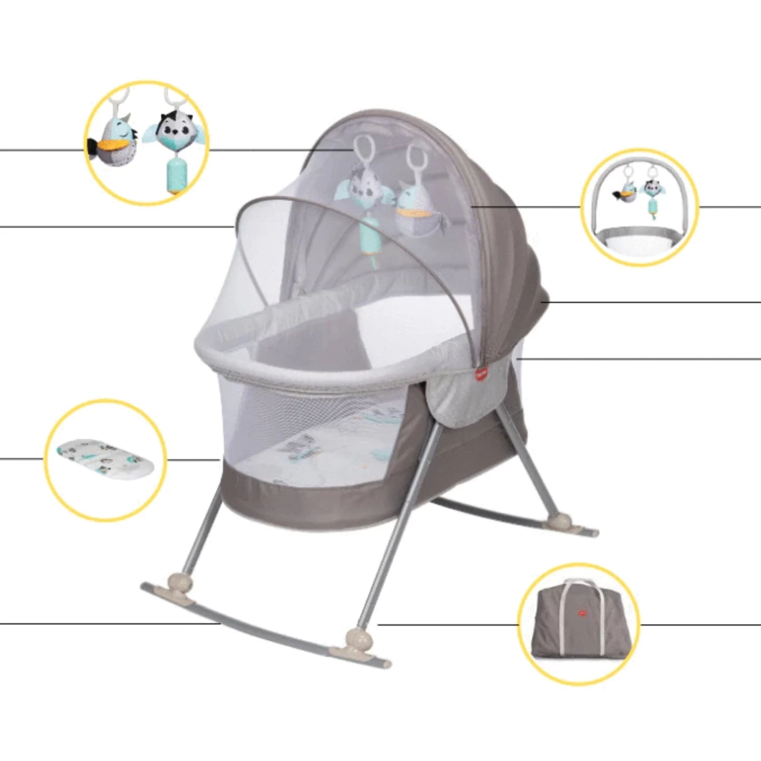 - Let your baby relax in the cozy bassinet while gazing up at the toys on the mobile or place the removable mat and mobile on the ground for tummy time