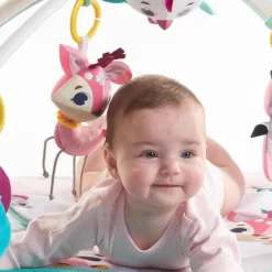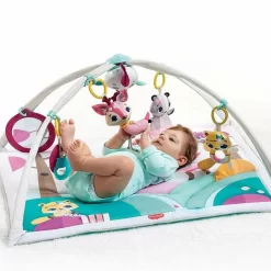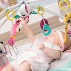 Your little one will love the colors, textures and shapes on the Tiny Princess Tales Gymini Deluxe. The 2-in-1 activity mat has adjustable arches, where adorable animals and textured toys hang to invite exploration and discovery.