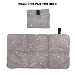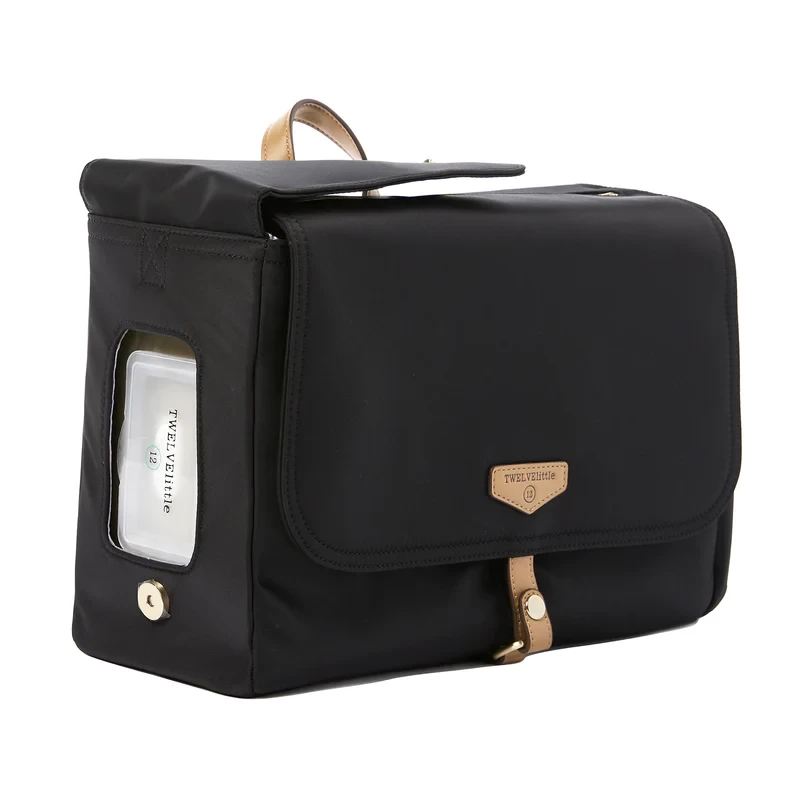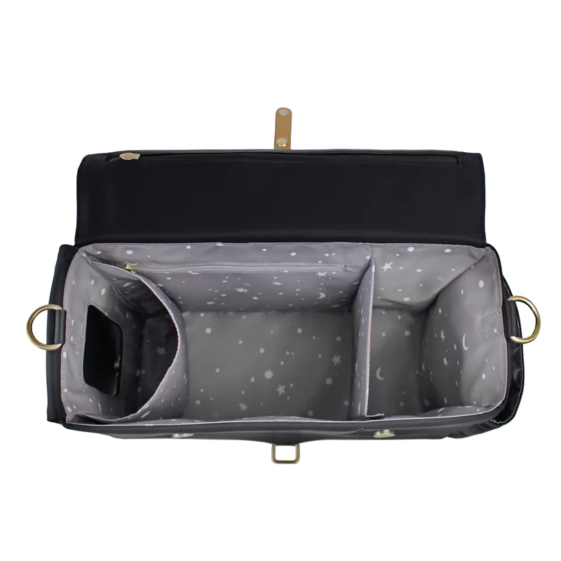 The On-The-Go Stroller Organizer is the perfect hybrid between a traditional stroller caddy and a messenger-style diaper bag. It comes with a set of stroller clips so you can attach it to the stroller bar, and also has a detachable long strap to be carried as a diaper bag. The stroller caddy organizer interior has multiple functions, including a separate area for baby wipes, which is accessible from the outside via a hidden magnetic flap cover, and a compartment divider that can be used to customize the interior space. The main flap has hidden magnetic closures on the front so you can choose to keep the bag open or closed, and an additional snap closure for extra security.