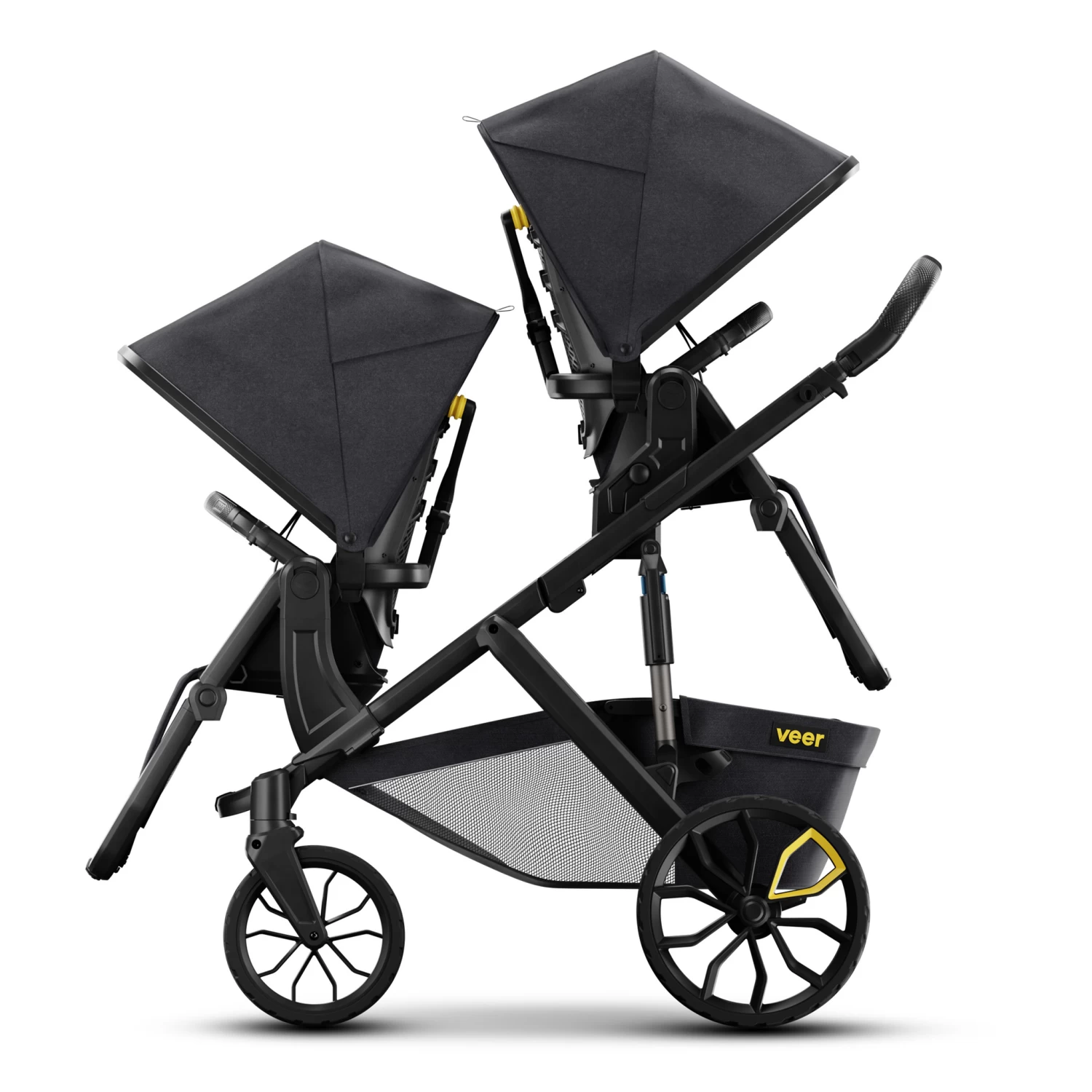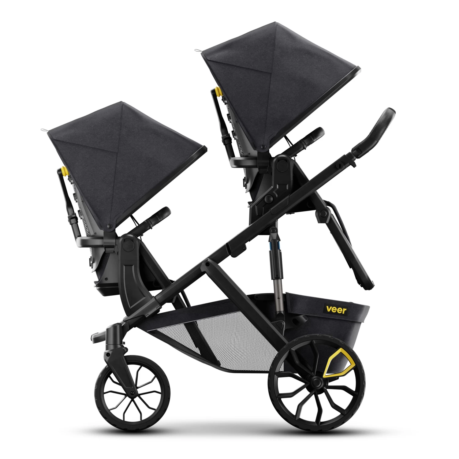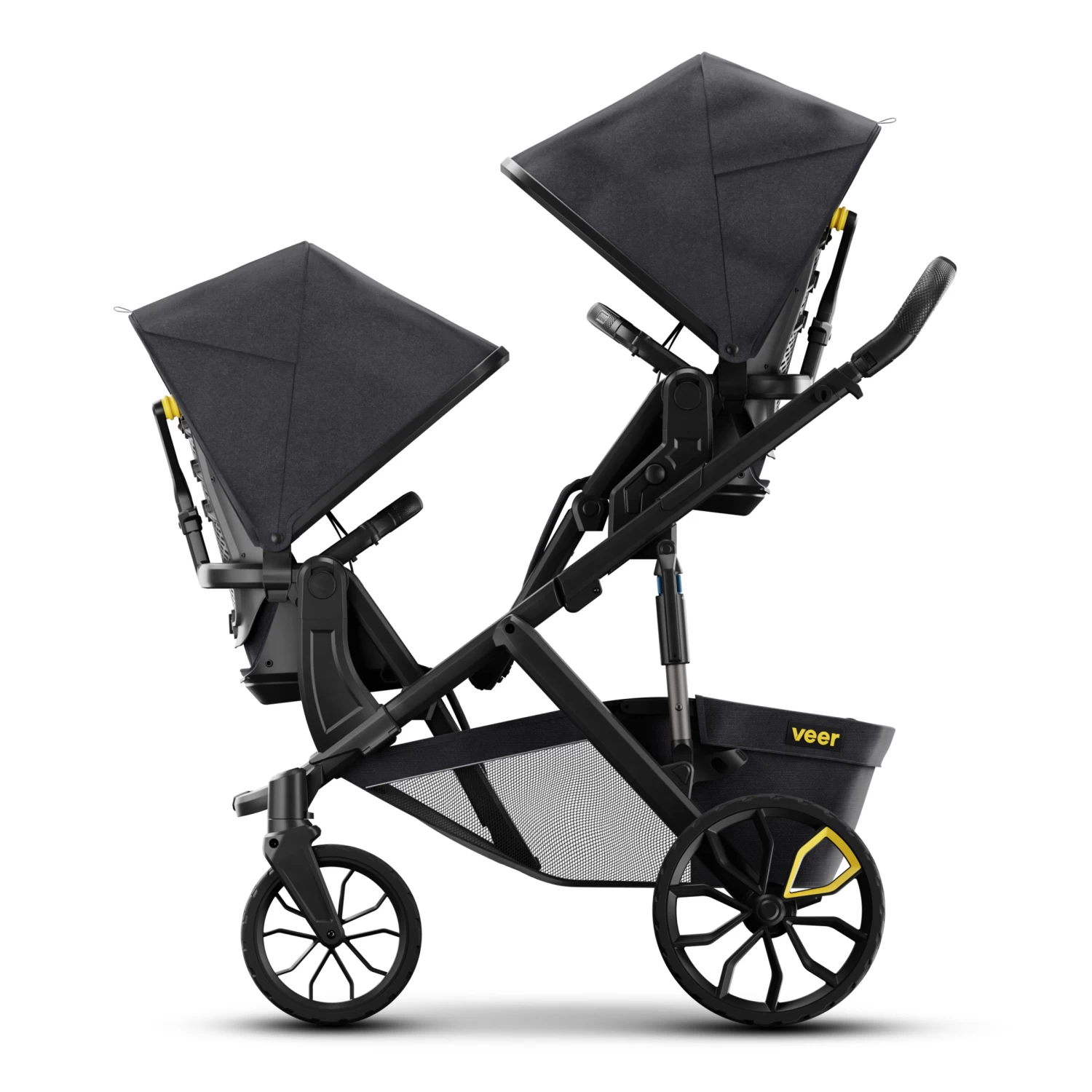 From cityscapes to landscapes, Veer’s double stroller makes wandering fun, easy, and rewarding. Comes with two switchback seats, one stroller frame and one second seat conversion kit and you can add on a infant car seats or a bassinet. With the adjustable suspension, you’ll get there in cushy comfort and style. Roam all terrains and don’t skip a beat!