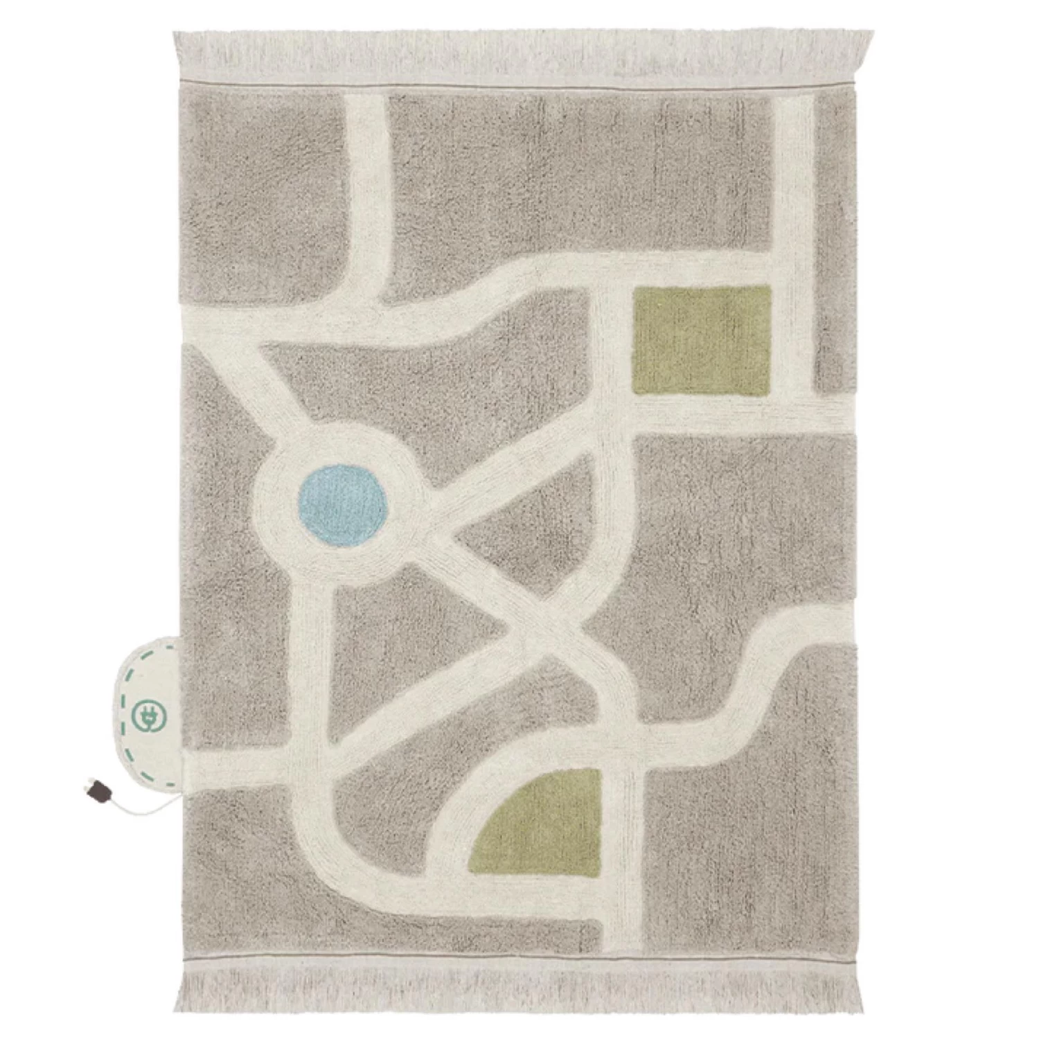 It’s playtime in the Eco-City! A place where kids learn by playing, where electric vehicles take over the hustle & bustle with their clean and quiet vroom-vrooms. Children can let their imagination run wild on this plush city map washable play rug, complete with its very own signposts, traffic lights, trees, e-cars, bikes, and even an EV charging station!