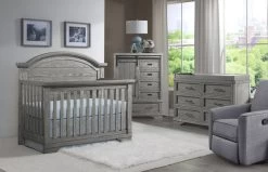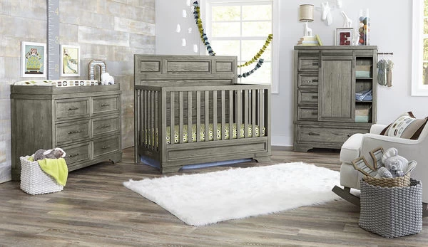 The Foundry Collection combines modern industrial style with classic wood designs. The Brushed Pewter finish and carved details offer timeless sophistication with a modern twist that will serve your growing child for years to come.Â